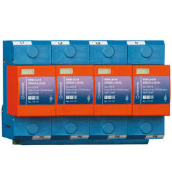 Мощное четыреполюсное УЗИП класса I+II коммутирующего типа со сменными рабочими модулями на основе искровых промежутков. УЗИП предназначено для защиты оборудования в низковольтных цепях до 1000 В от прямых и отдаленных молниевых разрядов при воздушном или кабельном вводах электропитания.